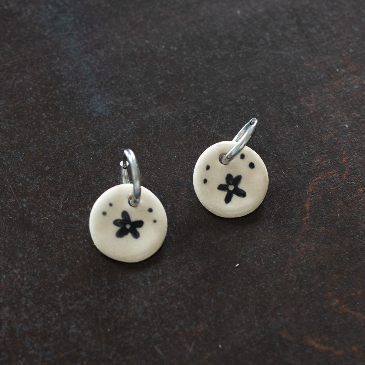 Ces boucles d’oreilles en céramique sont entièrement faites et peintes à la main. Le motif floral noir, minimaliste et spontané, évoque une fleur naïve entourée de petites éclaboussures. À la fois douces et affirm