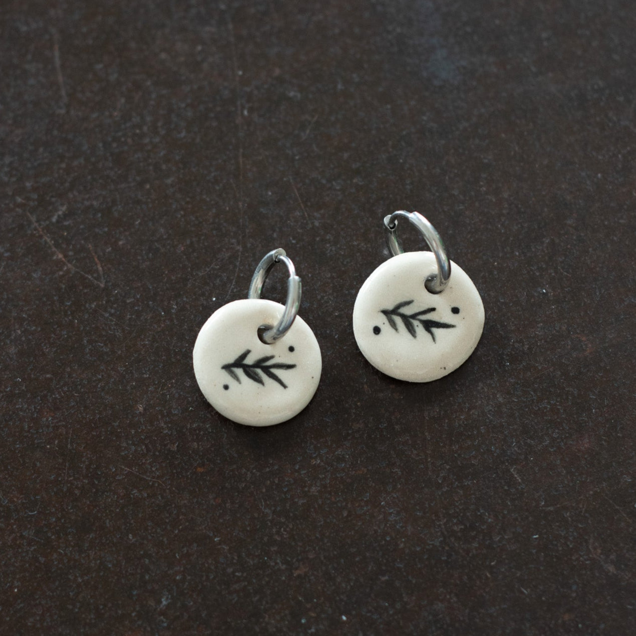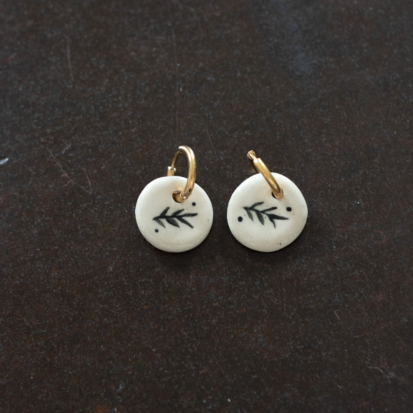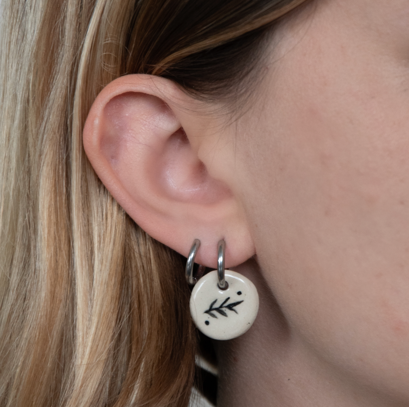 Légères, bohèmes et délicates, ces boucles sont façonnées à la main en céramique puis peintes une à une avec un motif végétal tout simple, tout doux. Le décor noir contraste subtilement avec la blancheur de la terre, pour une pièce à la fois sobre et pleine de caractère.