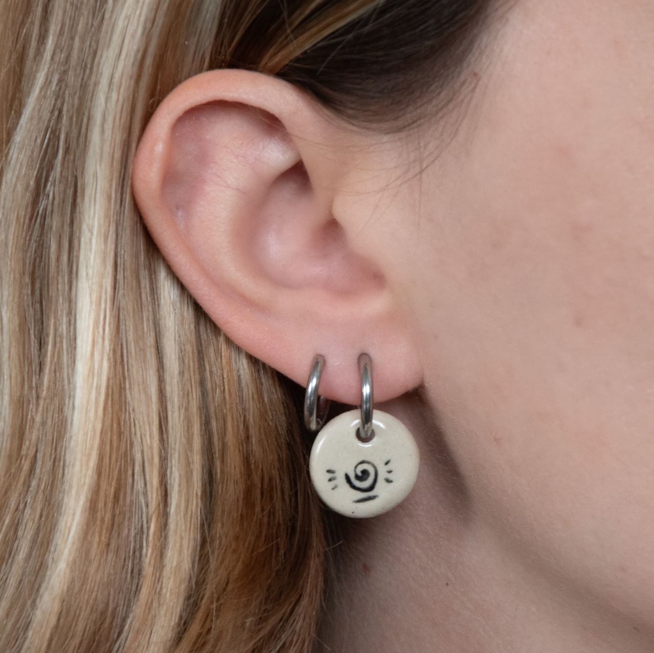 Ces boucles d’oreilles en céramique sont façonnées à la main puis peintes avec un petit motif en spirale, entouré de traits graphiques comme des éclats d’énergie. Elles évoquent la puissance douce d’un souffle, d’un élan créatif.
