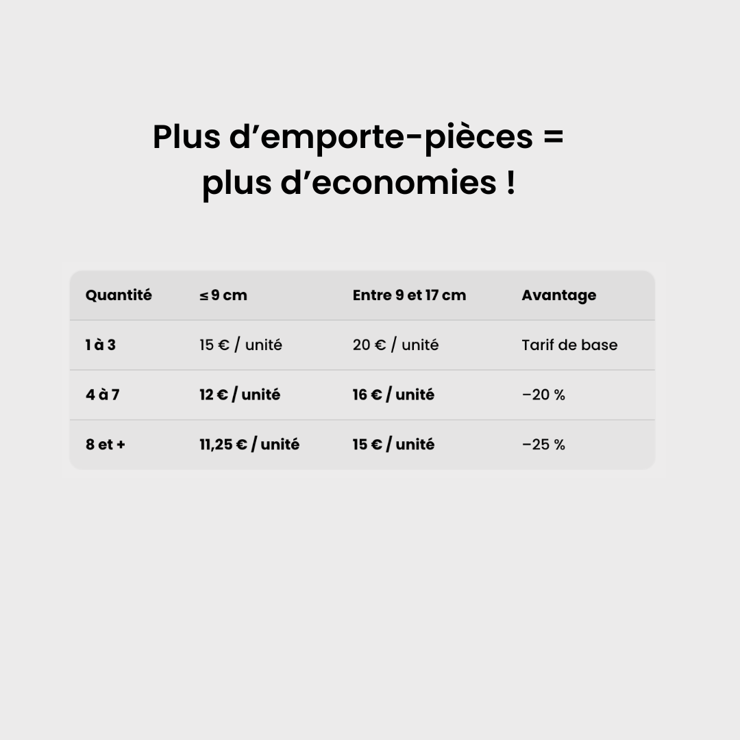 Les emporte-pièces sont imprimés en PLA biosourcé, un matériau solide, léger et durable.